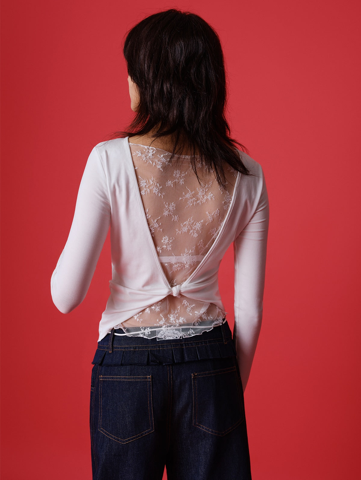 Statement Back Design: A lace-adorned, knotted open back delivers layered sex appeal and versatile style.